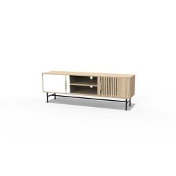 Rack para TV en madera de Paulownia y MDF con patas de acero de líneas minimalistas. Cuenta con puertas laterales para almacenar y dos estantes en el centro con apertura en el fondo para pasar cables y mantener la estética. Part Number: RAK45D Tipo: Rack TV Colores: Blanco, madera, negro Medidas: (largo, ancho, altura): 160 x 40 x 55 Material: Paulownia, MDF, acero
