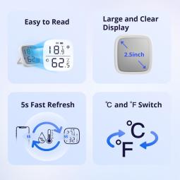Alta precisión y actualización rápida: Incorpora un sensor de higrómetro inteligente de fabricación suiza que proporciona lecturas más precisas, manteniendo una precisión de ±0.2°C/±0.4°F en temperatura y ±2% en humedad, actualizando las lecturas cada 5 segundos.