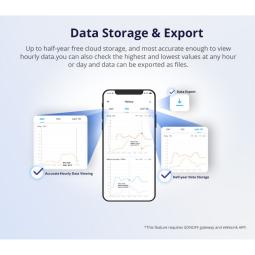 Almacenamiento y exportación de datos: Ofrece hasta medio año de almacenamiento gratuito en la nube y la capacidad de ver datos por hora con precisión. También puedes verificar los valores más altos y más bajos en cualquier hora o día, y los datos pueden exportarse como archivos.